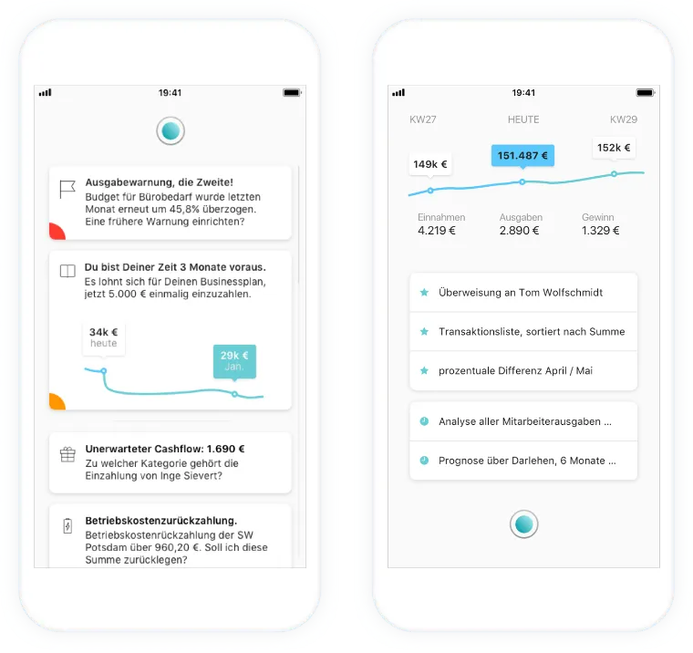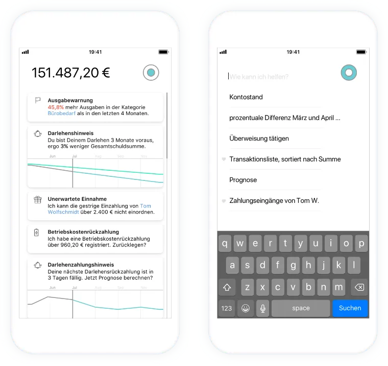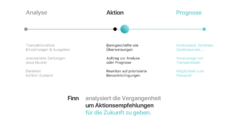 Otherwise, all communication with Finn takes place via the dashboard. If the user wants to make a transfer, start an analysis or call up a forecast, they can do so by entering text in direct communication with Finn.