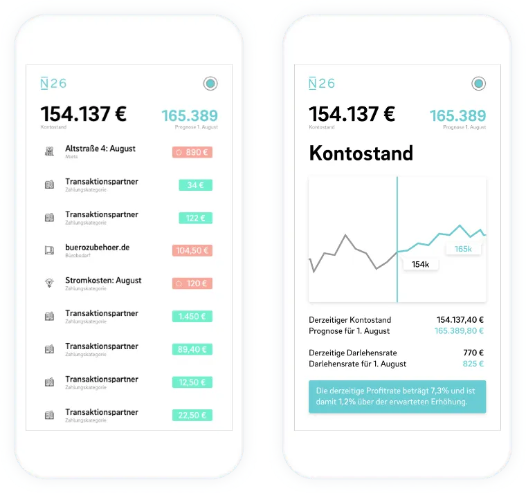 Numbers in black represent Finn's first two areas of activity, namely past and present. They therefore show previous incoming and outgoing payments on the account. All cyan-colored numbers represent a forecast by Finn, which Finn has calculated from the account movements of the last 6 months.