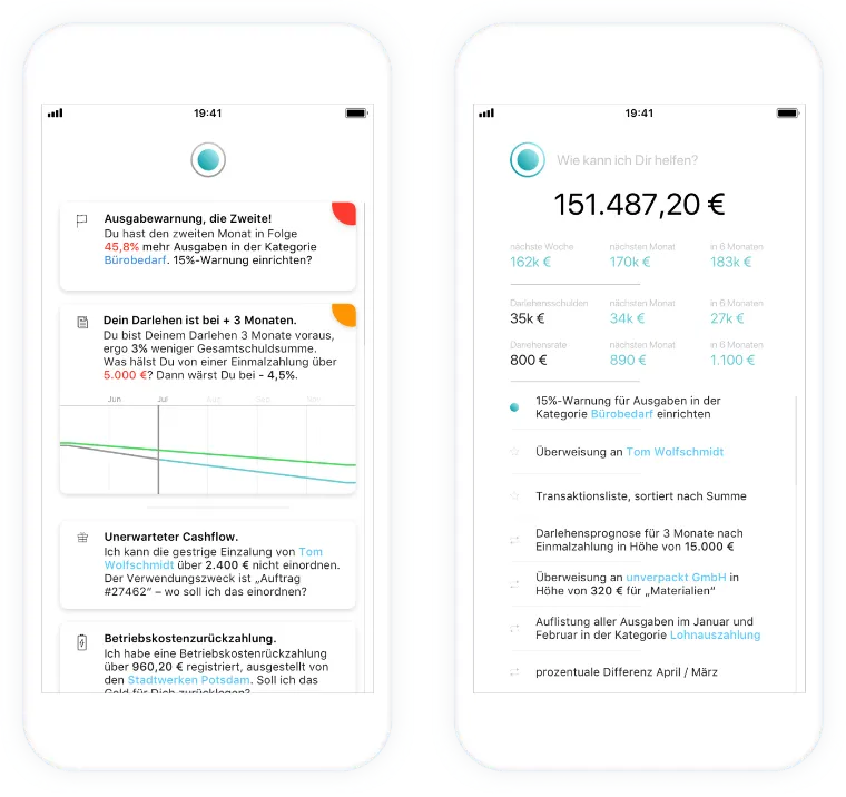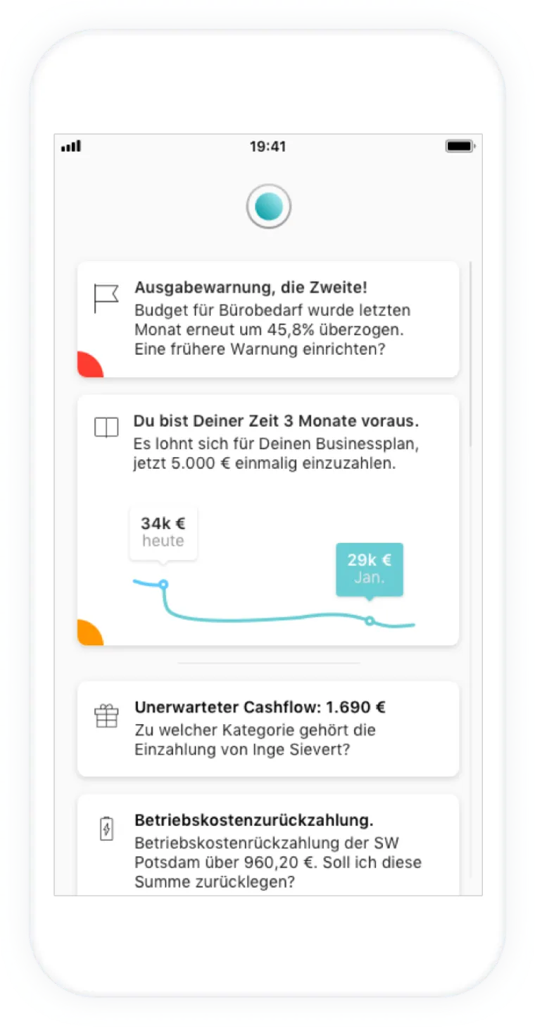 The user's loan plan contains a fixed amount that the company may spend per month on office supplies. If this sum is exceeded, Finn issues a warning and suggests an action. The user can either confirm this suggestion or select their own user-defined action using the navigation bar.