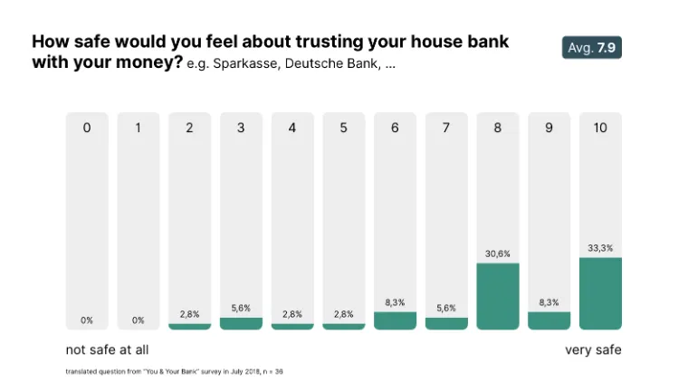 Our thesis was confirmed thereby - the confidence difference between house banks and online banks is immense. Our comparison value (since trust cannot be measured in a particular unit) is very clear here: house banks have a trust value of 7.9.